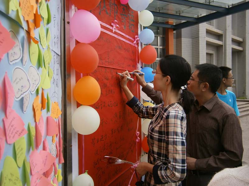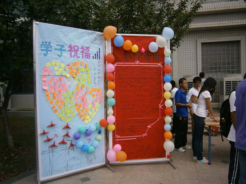 2011级学生党支部举办的“桃李满天下,师恩似海深”的教师节祝福墙活动在南一食堂门口火热地进行着。