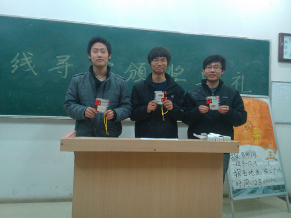 此次活动采用团队制,全体参赛人员分为七组,每组九队,每队两到三人不等。随着比赛开始口令的响起,队长们首先冲出出发室,队员们则在终点室等待队长寻找到第一个信号源后,与队长共同寻找剩下的两个信号源。室外虽有些许寒风,但各组队员都不畏严寒,积极主动,争分夺秒,分工合作,为尽快找到信号源贡献自己的力量。最为突出的是“BOSS”组,十七分钟内完成了任务,勇夺无线寻宝桂冠,紧随其下的是“蓝光”组和“team.3”组,分获二三名。赛后颁奖典礼上,获奖者们都得到了丰厚的奖品,也为自己的大学生涯添上了浓墨重彩的一笔。
