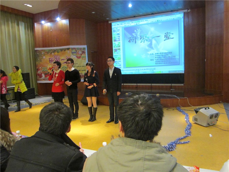 2012年12月26日晚厂长资源 、经济与管理学院、教育科学与技术学院三院联合举办的“研聚一堂,双旦晚会”在大学生活动中心三楼多功能厅火热上演。厂长资源 研究生辅导员陈素兰老师,经管院肖国丰老师,教科院张剑波、张超老师,校研会主席团及部分兄弟院系的研会主席应邀出席了这次晚会。