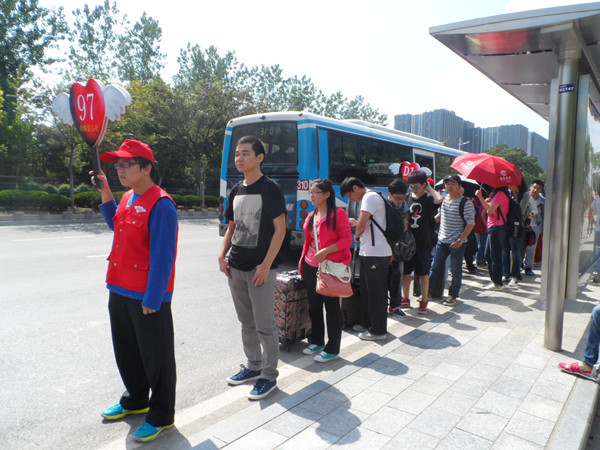 从上午10点半开始,爱心社的社员们就等候在公交站台前,按照计划,高举着公交车牌,对各个乘车线路的乘客进行分流,引导乘客们有序排队,文明乘车。在等候的时间里也不忘提醒回家的同学们注意交通安全和财产安全,增强乘客的安全意识。十一放假前日是各高校学生回家的高峰期,极易发生交通拥堵或者满座的现象,为此,爱心社还积极联系南京公交公司增加车次,公交公司得知爱心社的这一行动后非常支持,专程增加了97路和D1路公交的班次,很好地缓解了学生坐车难的问题。