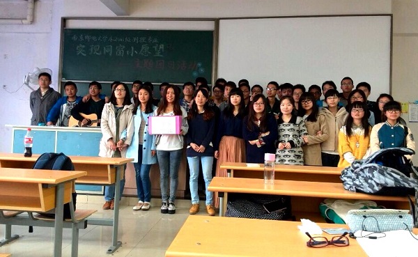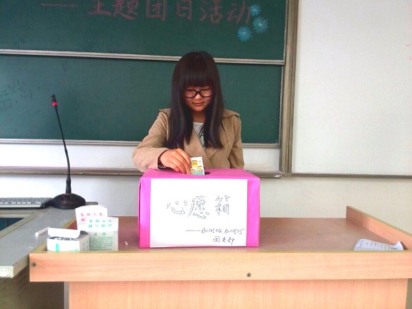 2014年4月10日下午,支部于南邮仙林校区教3-515举行了愿望采集仪式。宣传“中国梦”精神、介绍本次活动的目的和意义、并发动同学们以卡片形式写下愿望并投放心愿箱。仪式结束后,班委将大家的愿望整理并展示于公共主页,其中许逸君同学的愿望是:希望班上同学每人以“我想记得、我会怀念”句式写一句歌词,帮助自己创作班歌。