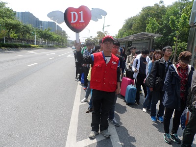 五一放假前夕会有大批学生坐公交出行游玩或回家,站台往往人群拥挤,很容易造成无序和混乱。为了维持秩序保障同学们的安全,由爱心社的志愿者在公交站台通过高举公交车牌来引导等候公交车的同学整齐有序地排成两队,一队是乘坐97路的,另一队是乘坐D1的。活动过程中,爱心社的社员们通过耐心的疏导,保证了乘客们有序排队,文明乘车,现场秩序井然。看到爱心社的志愿者放弃放假回家的机会辛苦维持秩序,绝大部分的同学都自觉响应此次活动,积极配合志愿者们的引导,以此来表示对他们工作的尊重与支持。