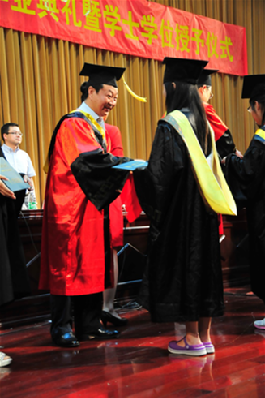 最后范书记宣布学士学位授予仪式正式开始,毕业生们依次上台,请导师为他们拨流苏并接过导师手中的学士学位证书,同学们完成了从学生到学士的转变。完成仪式后,毕业生代表向学院赠送纪念礼物,感谢母校的培育之恩。
