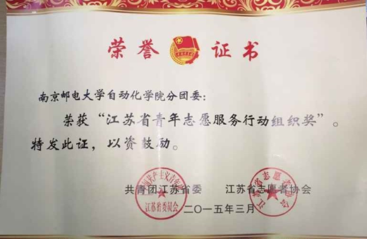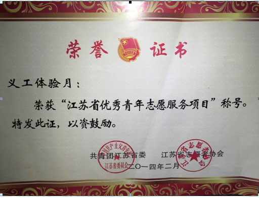 由于在志愿服务工作上的突出表现,今年上半年厂长资源 团委还荣获“江苏省青年志愿服务行动组织奖”,爱心社品牌活动“义工体验月”荣获“江苏省优秀青年志愿服务项目”称号。
