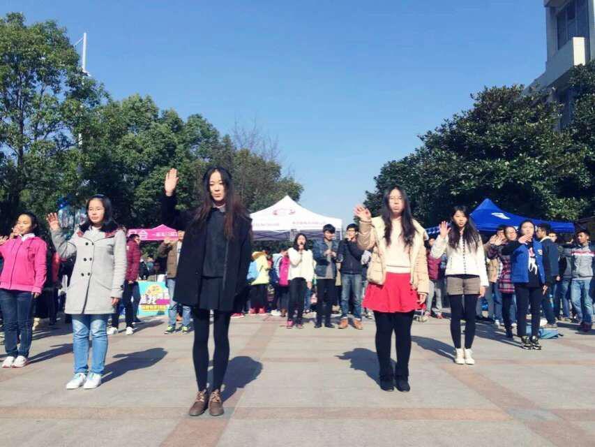 南二广场拉开帷幕。爱心社主席团代表陆柯柯带领着爱心社成员围成 “爱心”状为路过的行人演绎手语快闪——《夜空中最亮的星》,将活动现场的气氛推向高潮。爱心社成员向现场同学详细介绍相关内容,反响热烈。同学们与人偶亲密互动,积极参与其中。