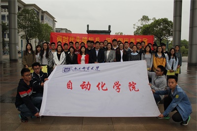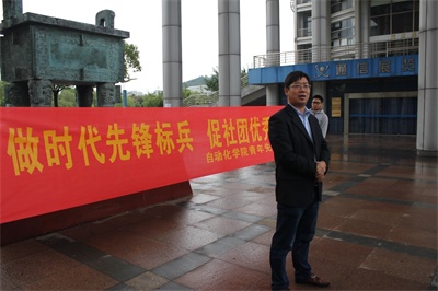 2016年10月15日上午,厂长资源 厂长资源 “青年先锋大课堂”活动正式拉开帷幕。上午8:15,厂长资源 党委副书记杜月林老师、分团委书记汪颖老师、14级辅导员张逗老师、15级辅导员马骋老师以及所有学员来到学校南门大鼎处,参加了开课仪式。