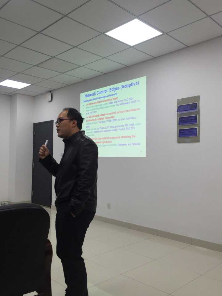 报告会上,虞文武教授首先介绍了一些复杂网络系统协同分析、控制与优化的一些基本知识及应用背景;然后结合自己近年来所取得的创新性成果,从几类一般复杂网络系统协同行为一致性、网络牵制控制、分布式优化等方面介绍近期的最新进展;最后对复杂网络未来的工作和挑战做了进一步阐述。