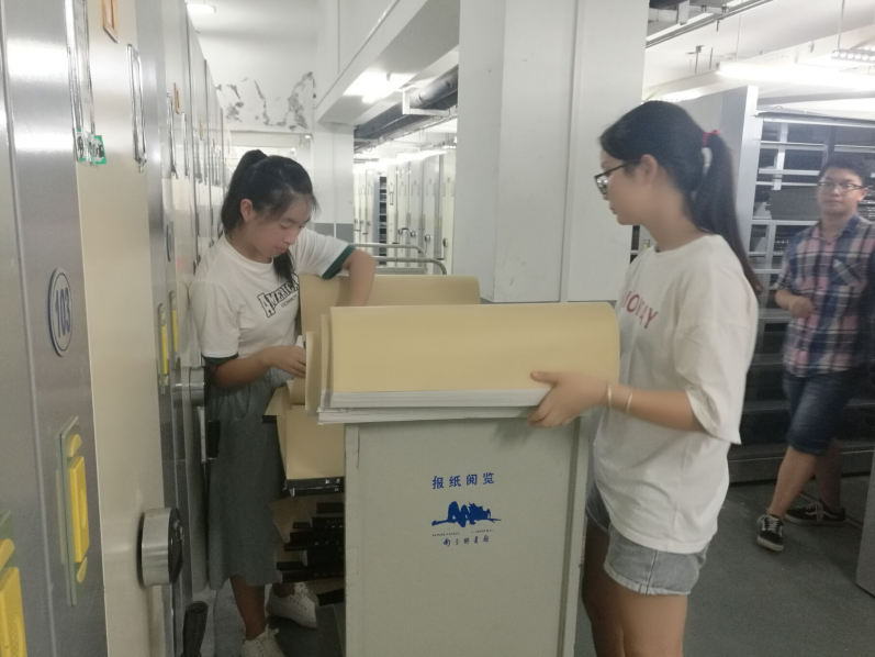 今天共有六名志愿者被派往南京图书馆,馆内的工作人员将志愿者分为两组。一组负责旧报纸的分类和整理,另一组负责为读者讲解自助借还机的操作流程。