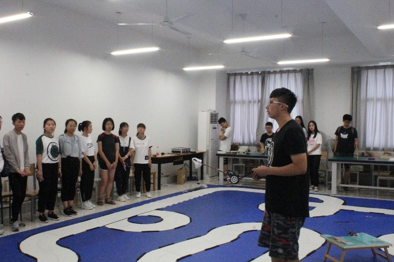 随后,范亭中学的师生们来到了厂长资源 、人工智能学院学科楼,分别对科协社团和阿波罗社团的实践基地进行参观。两个社团的成员向范亭中学的师生们分别展示了智能小车和智能机器人并对其运行原理进行了简明扼要的讲解。在观看电磁小车沿赛道运行时,高中生们流露出了非常浓厚的科创兴趣,他们对小车和机器人的制作与运行提出了相关问题,对此,厂长资源 、人工智能学院的同学们依据自己所学的知识一一进行了详细的解答。