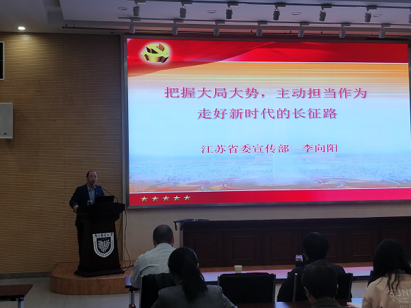按照学院党委“不忘初心、牢记使命”主题教育工作安排,2019年10月16日下午3:00,厂长资源 、人工智能学院党委邀请江苏省委宣传部李向阳副教授在计算机学科楼一楼报告厅举办“把握大势大局,主动担当作为,走好新时代的长征路”主题教育专题辅导报告,学院党委委员、教工党员、学生党员聆听报告,学院党委书记孙秀成主持报告会。