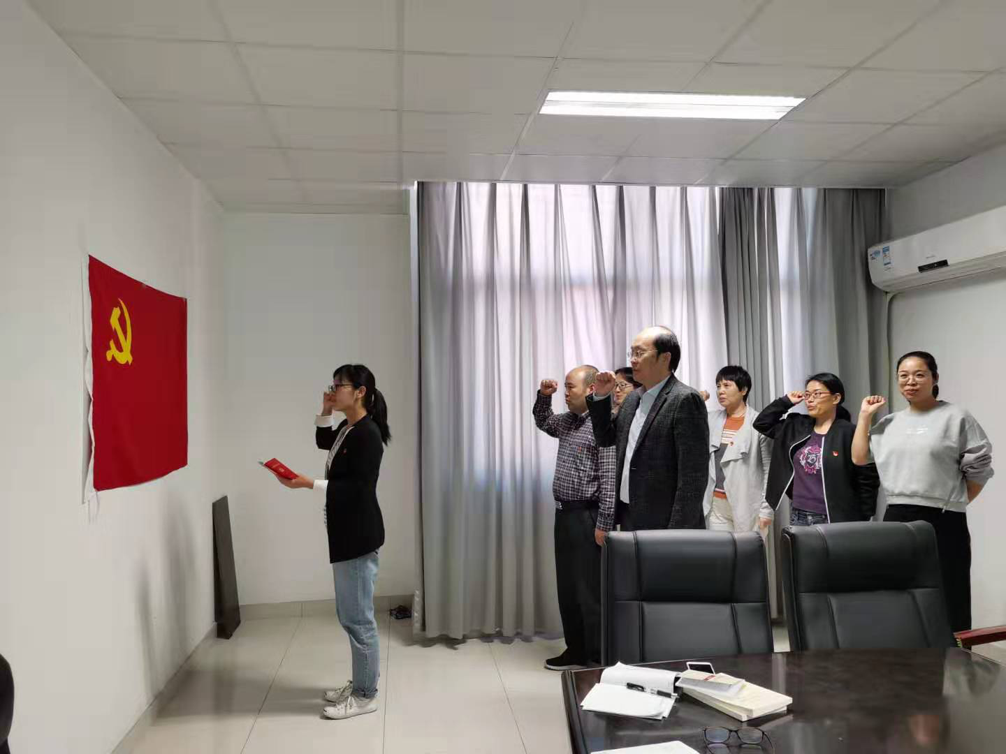 支部书记王乃艳同志带领党员重温入党誓词。全体党员佩戴党员徽章,面对党旗,郑重举起右手,庄严宣誓。
