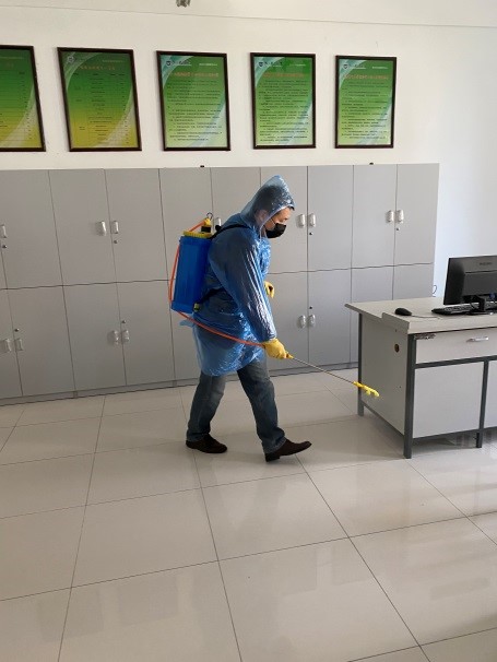 自4月28日上午开始,中心全体老师首先领取了消毒用医用口罩、一次性手套、洗手液、消毒剂等防疫物资,按照学校防疫工作规定,定点放置在各实验室;在切断电源开关、紧闭门窗的情况下,对学院学科楼一楼、二楼全部的教学实验室,使用稀释的84消毒溶液进行整体实验室地面的喷洒消毒工作;同时,对消杀完毕的房间,作用30分钟以上后开窗通风。地面消毒完成后,实验中心老师轮流作业,先用酒精湿巾对仪器设备、桌椅、门窗把手等接触部位进行消毒作业,然后对地面进行卫生清洁,尽最大可能不留死角盲区。
