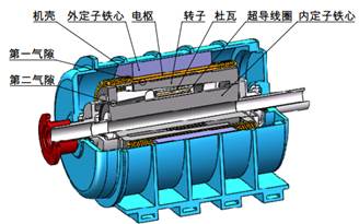 关键技术: 团队张文峰博士自主提出了该新型旋转极靴式超导电机结构。旋转极靴式超导电机将常规有铁心“半超导”电机极靴与磁极铁心分离(“半超导”电机励磁系统如图 3所示,包括超导线圈和磁极铁心,磁极铁心为由极靴、极身和转子轭等组成的整体),由极靴单独旋转作为电机转子,极身和超导线圈通过结构调整,转换为只有单个超导线圈和铁心组成的内定子。内定子与转子通过第二气隙组成励磁回路,共同构成电机的励磁系统。这样的励磁系统保证了超导线圈工作于静止状态并且有效地降低了转子的转动惯量。 在此基础上,张文峰博士深入分析了该型电机的工作原理,基于商用软件二次开发技术编制了该型电机的电磁设计专用软件,深入分析了电机三维磁场分布特点及其对超导线圈的影响、优化了电机结构。基于多物理场分析方法建立电机的磁-热-结构多场耦合模型,分析了电机不同运行状态的应力应变、温升情况,保证了电机设计的可靠性。