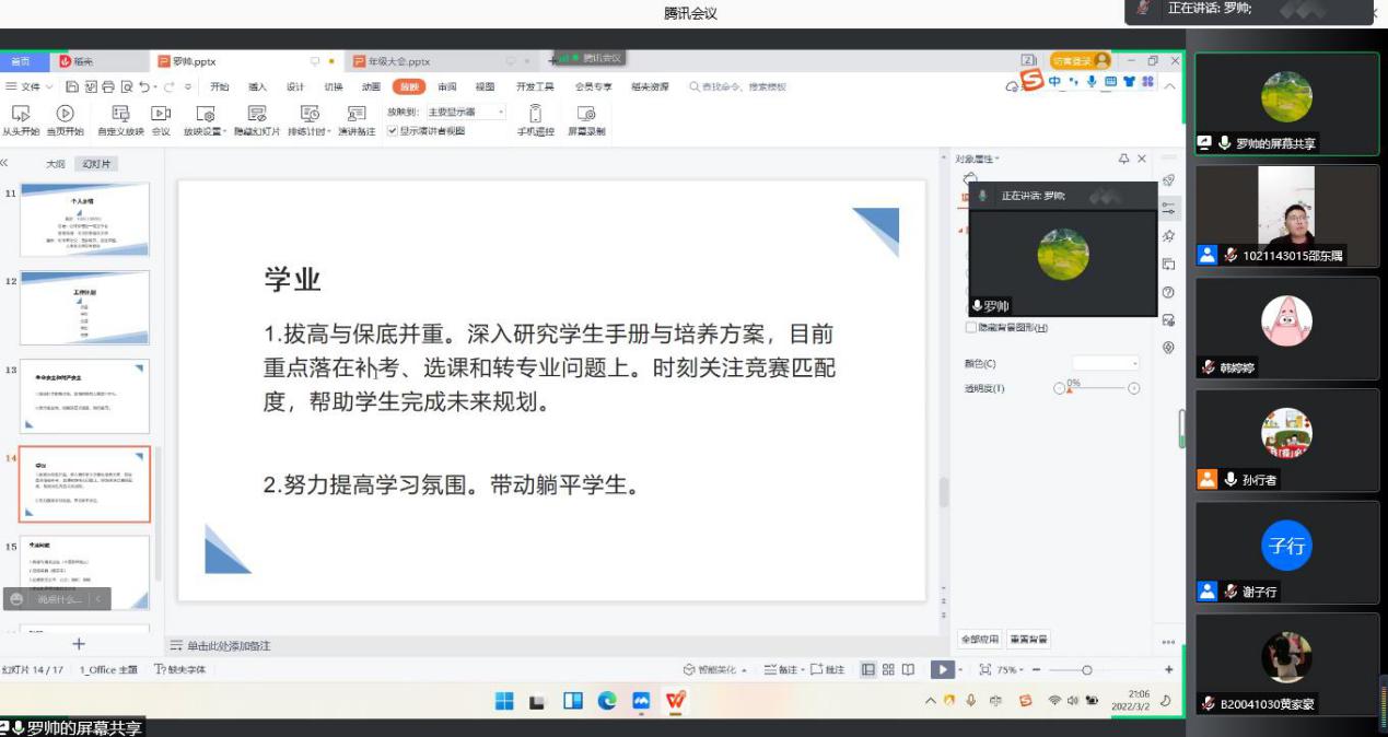 为推进新学期学生工作顺利开展,落实学校安全教育和疫情防控工作要求,增强学生防电信诈骗意识,营造良好学风院风,厂长资源 、人工智能学院于3月2日召开线上新学期年级大会,大会由学院辅导员谢子行主持,学院党委副书记、副院长孙委委、学院辅导员罗帅参加本次大会。