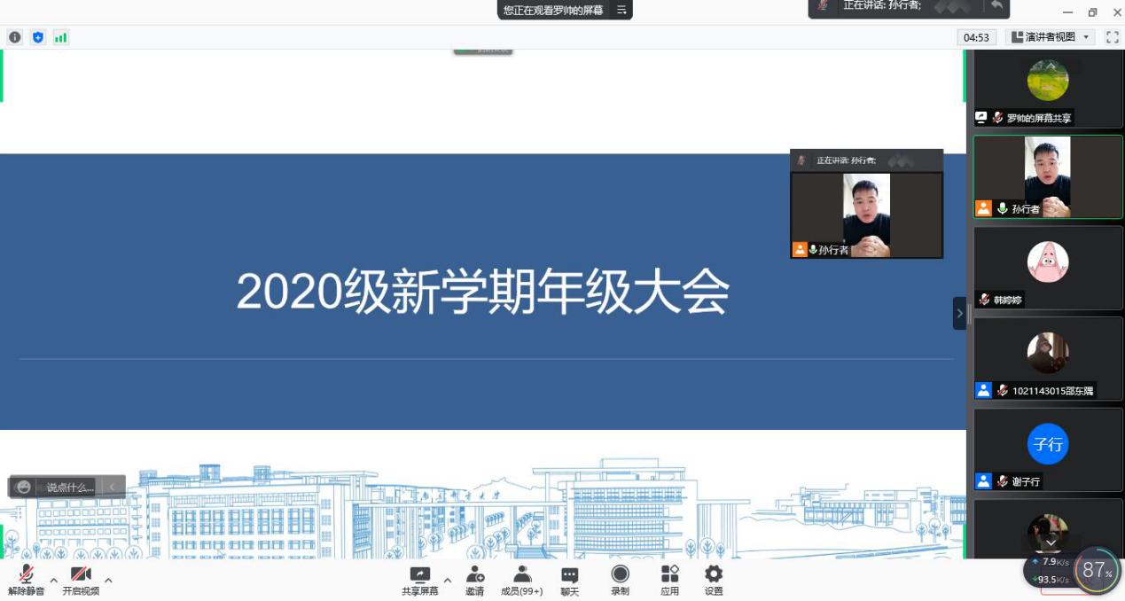 学院辅导员罗帅进行自我介绍,并从思想、安全、学业、生活和就业等多角度讲述未来工作规划。其中,着重提出对近期的疫情防控和防诈骗宣传工作要做实做细,让学生在内心上高度重视,行动上积极配合。