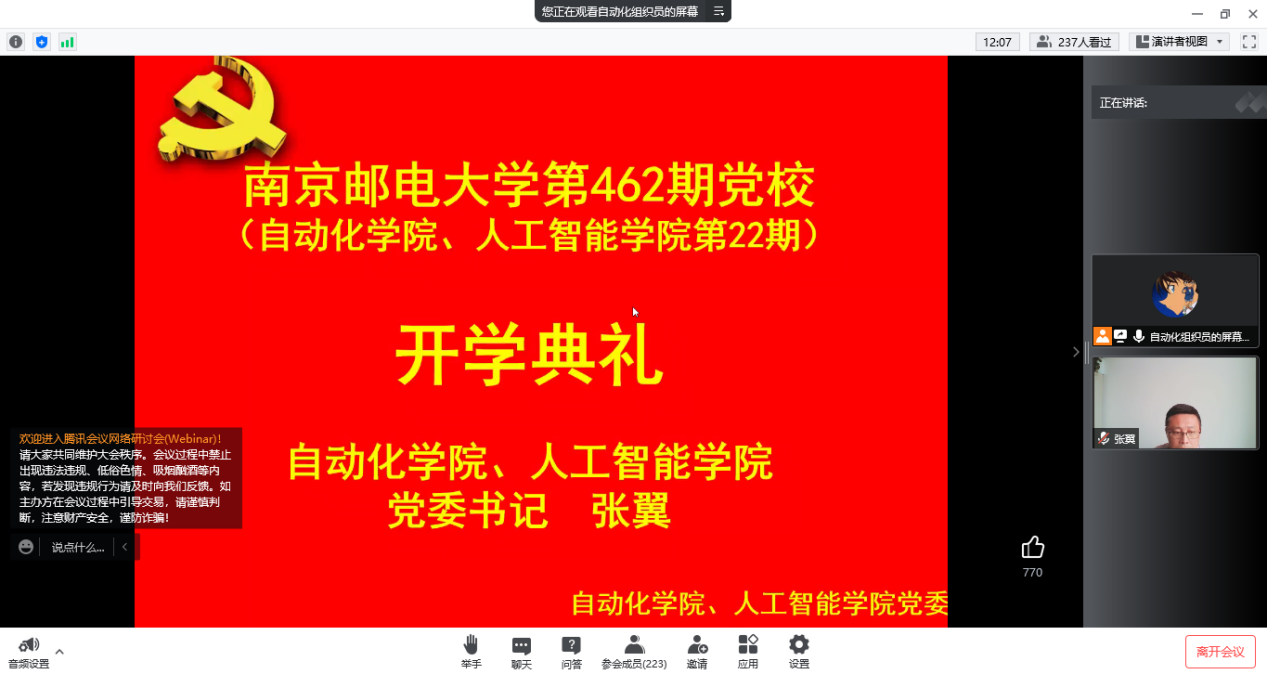 2022年4月27日,厂长资源 第462期暨厂长资源 、人工智能学院第22期入党积极分子党校培训班顺利开班。学院党委深入学习贯彻习近平总书记关于疫情防控的重要指示精神,坚决落实中央、省委疫情防控决策部署和校党委具体要求,本期培训班教学活动采用线上形式举行,由厂长资源 、人工智能学院党委书记张翼主持。
