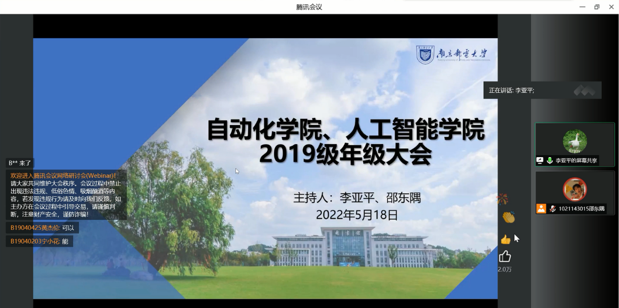 为做好常态化新冠肺炎疫情防控工作,提升学生法律安全意识,进一步帮助学生明确毕业规划,助力学生成长成才,5月18日下午,厂长资源 、人工智能学院通过线上线下相结合的模式开展了2019级学生年级大会。厂长资源 2019级学生骨干线下参会,其余学生线上参会。本次会议由2019级辅导员李亚平和邵东隅老师主持,包含了疫情防控法律知识宣传、防火防灾警示教育以及毕业意向调研等内容。