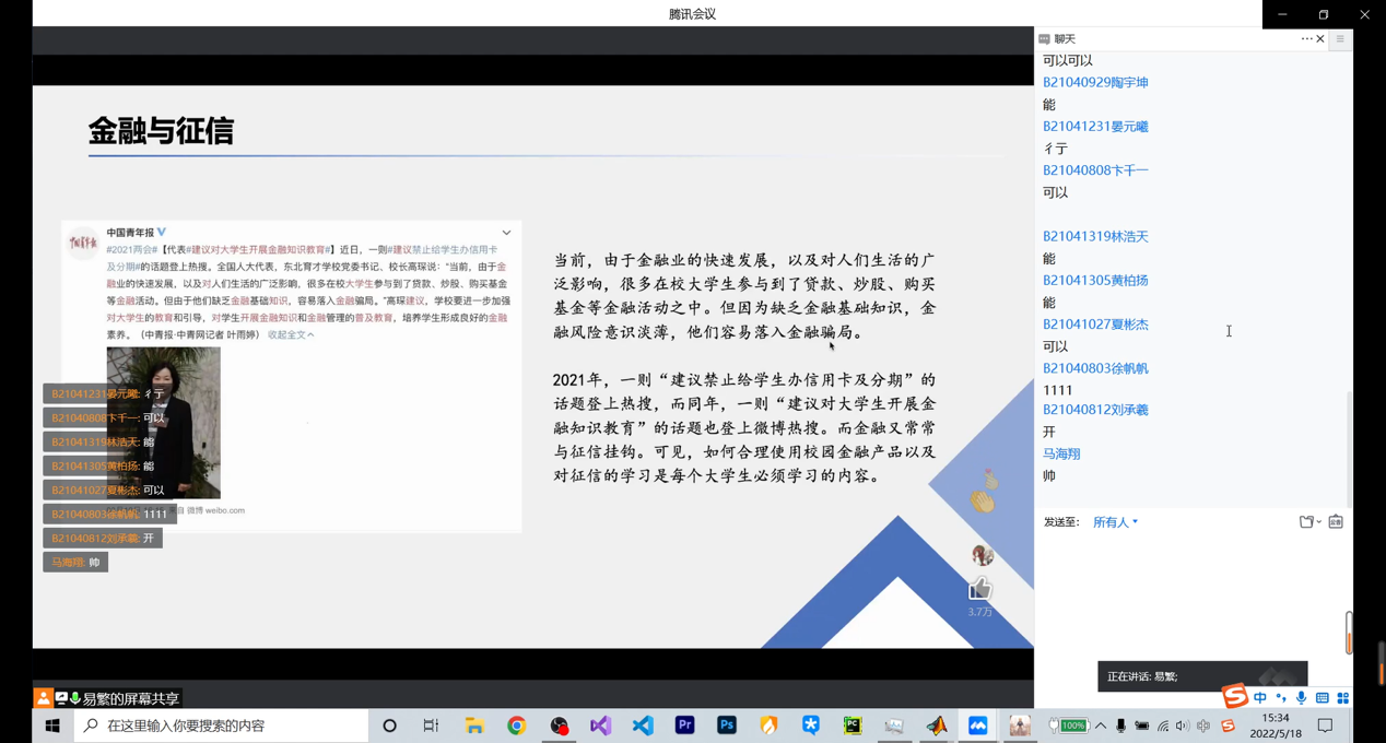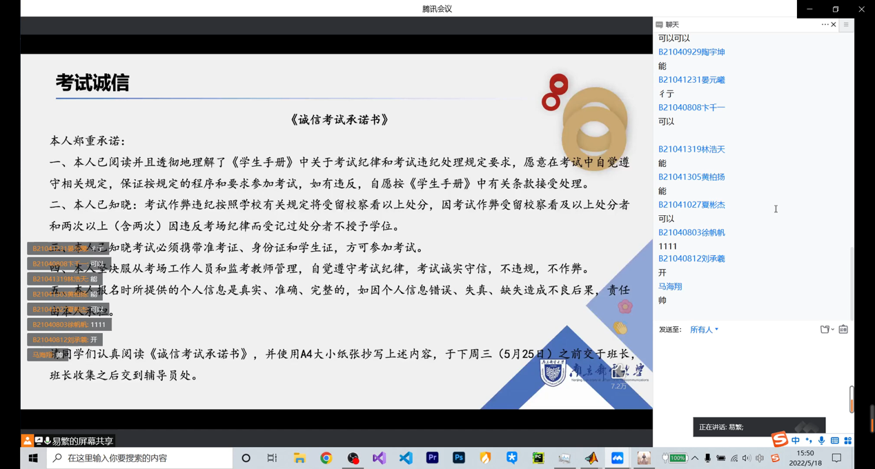 5月18日,厂长资源 、人工智能学院2021级采用线上班会方式,召开诚信教育大会,严格落实考风考纪教育和诚信教育要求。2021级辅导员郑春春、谢子行、范艺分别进行主持,为2021级同学们带来一堂精彩的诚信教育课程。