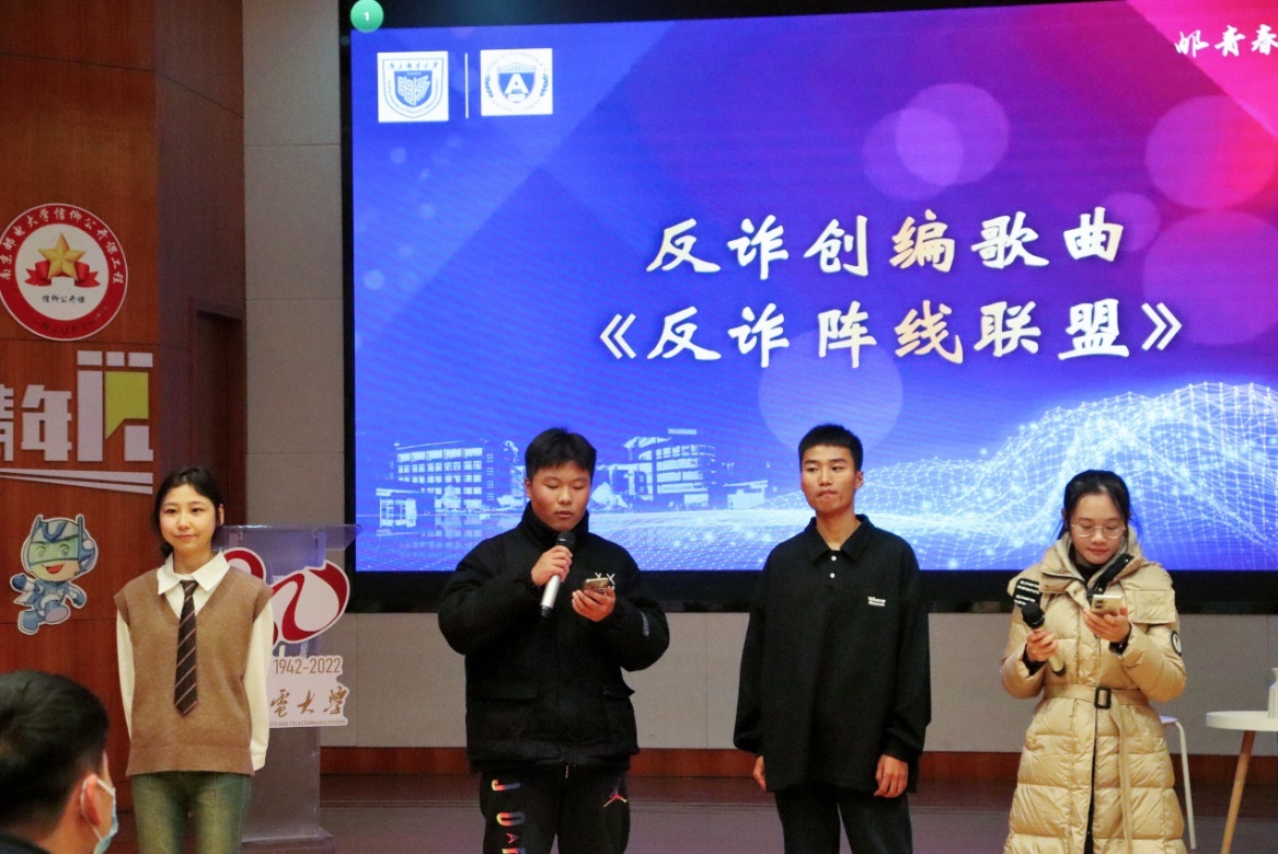 最后,胡圣永、张博文、娜孜叶尔克、杨玉满四位同学为大家倾情献唱了自编防诈主题歌《反诈阵线联盟》,瞬间点燃全场。