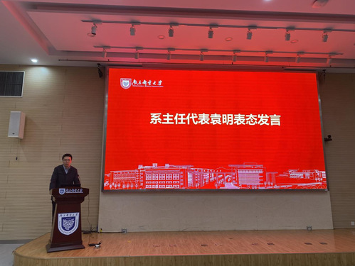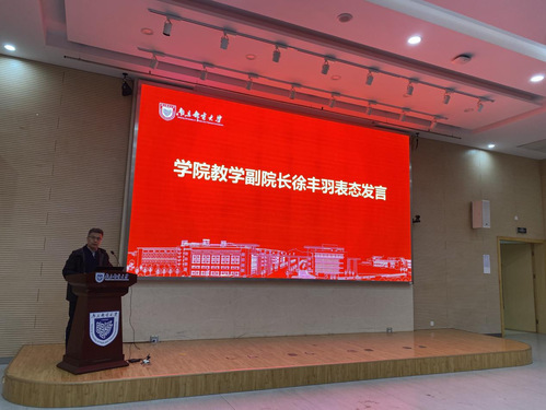 学院教学副院长徐丰羽、系主任代表袁明作表态发言。徐院长表示,将组织全院老师进一步深入学习审核评估相关文件,理解其内涵和要求,以高度的责任心和实事求是的态度对待评估,严格纪律、分清主次、统筹兼顾、分工明确,高质量完成评建工作任务。袁明老师表示将全力配合学校和学院的各项工作部署,认真审视目前教育教学中优势与不足,全面贯彻落实OBE教育理念,从培养目标、课程体系、实践教学条件、教育教学改革等方面做好人才培养。
