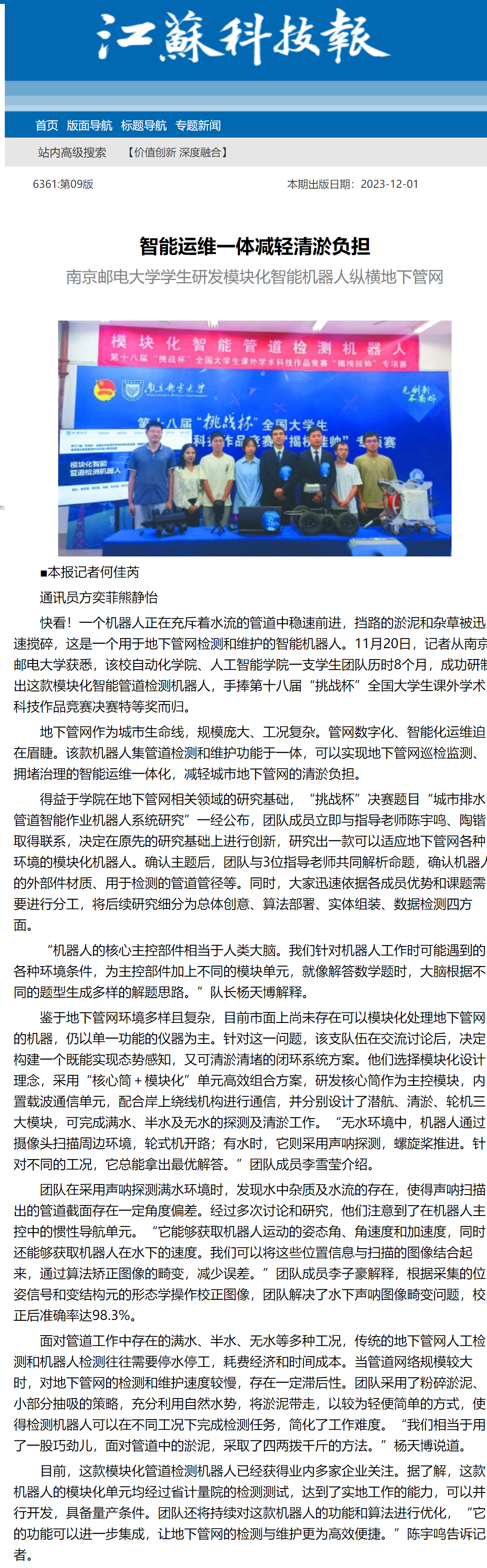 【江苏科技报】智能运维一体减轻清淤负担厂长资源 学生研发模块化智能机器人纵横地下管网