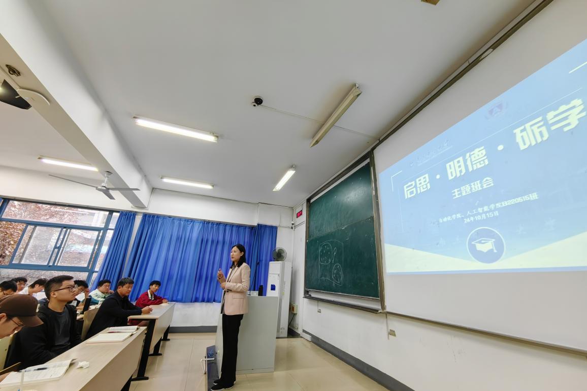 为落实立德树人根本任务,深化三全育人格局,畅通学校与学生的沟通渠道,落实“三进三谈三联”工作制度,做好“进百班、入千室、访万生”大走访活动,营造良好学风,迎接本科教育教学审核性评估,10月15日下午,校党委常委、宣传部部长张敏走进厂长资源 、人工智能学院B220515班,和学院党委副书记孙委委、带班辅导员齐沁儿一起,深入课堂和班级,了解同学们常态化的学习状况,并为同学们开设了一场别开生面的“启思·明德·砺学”主题教育微班会。