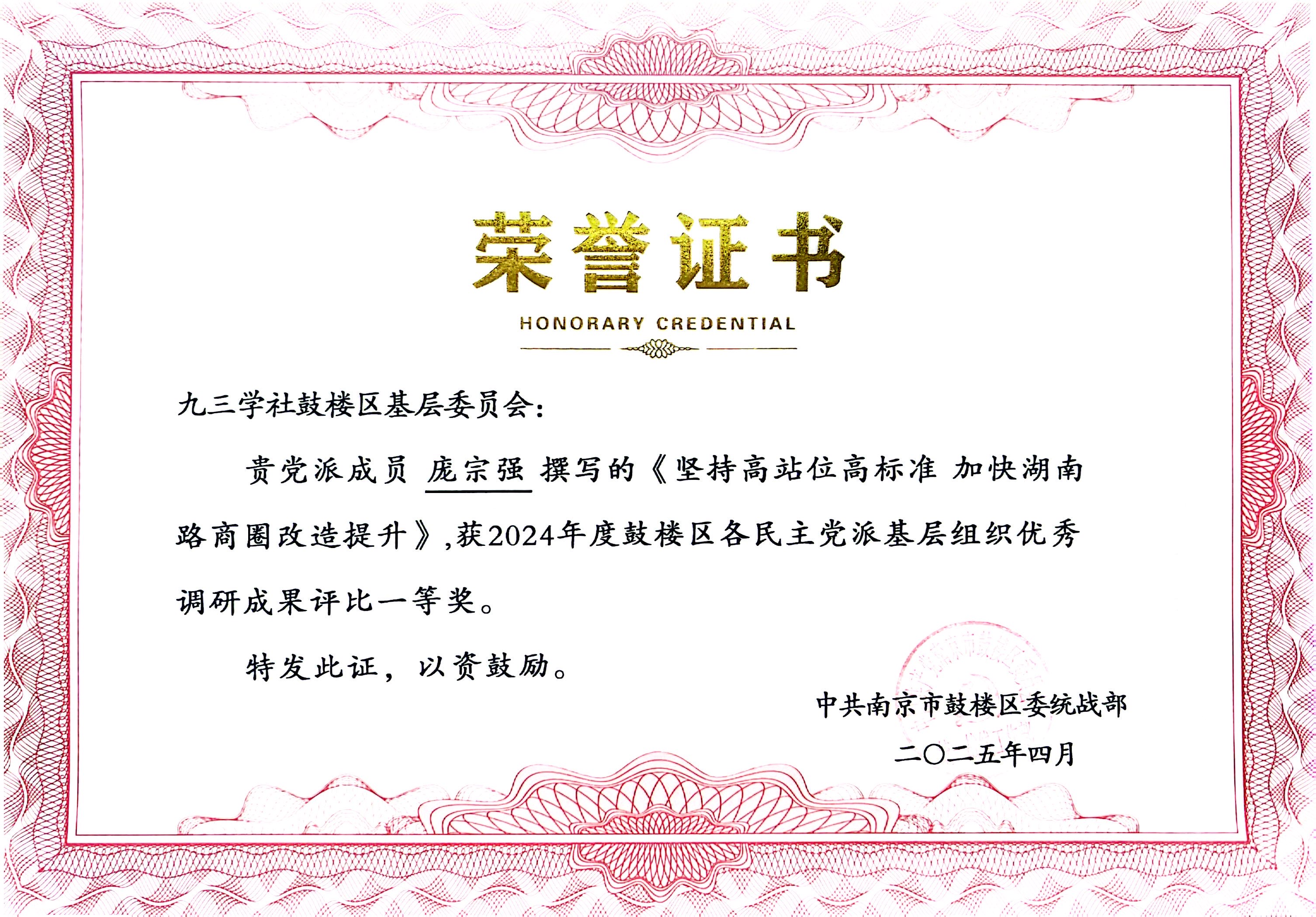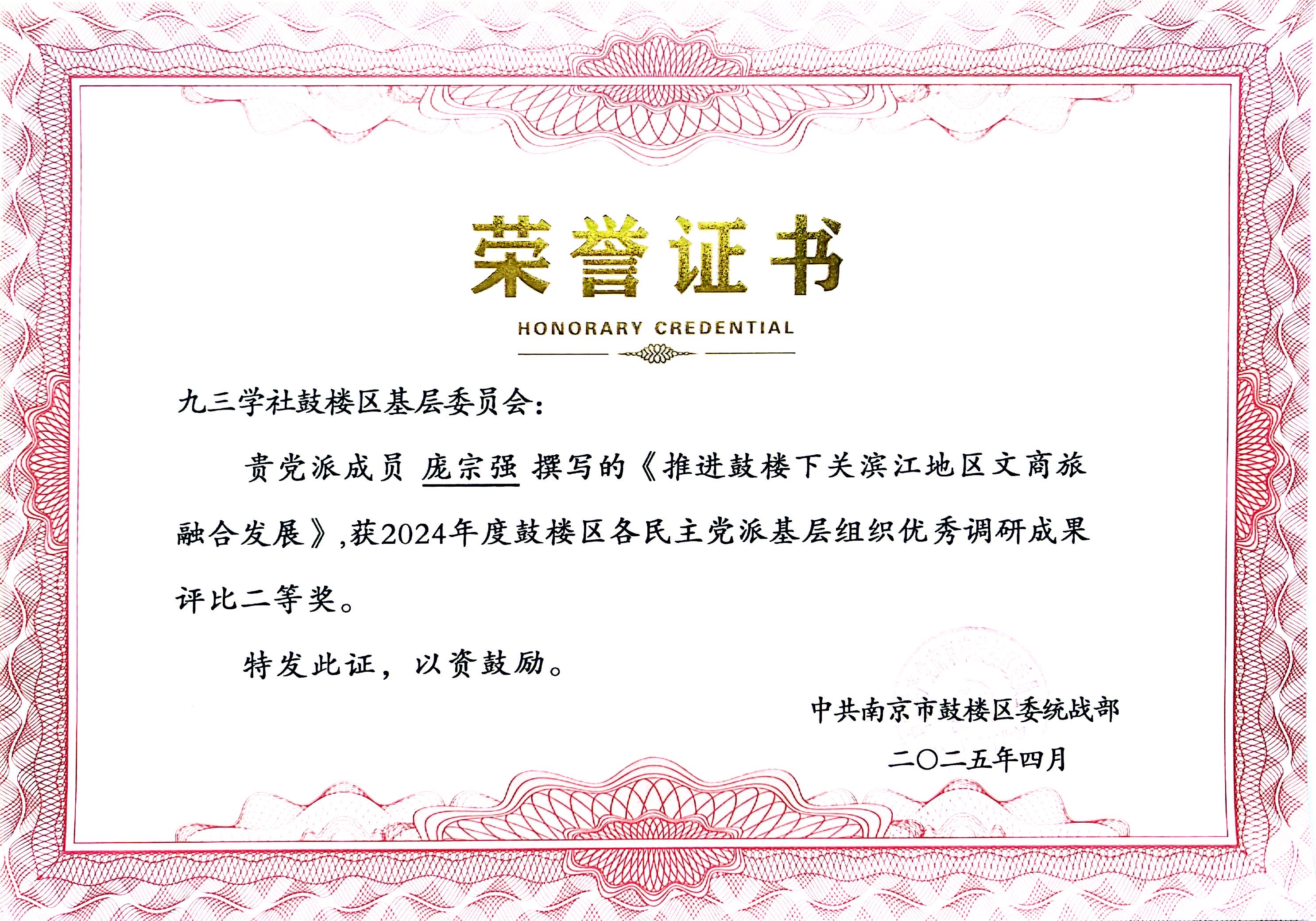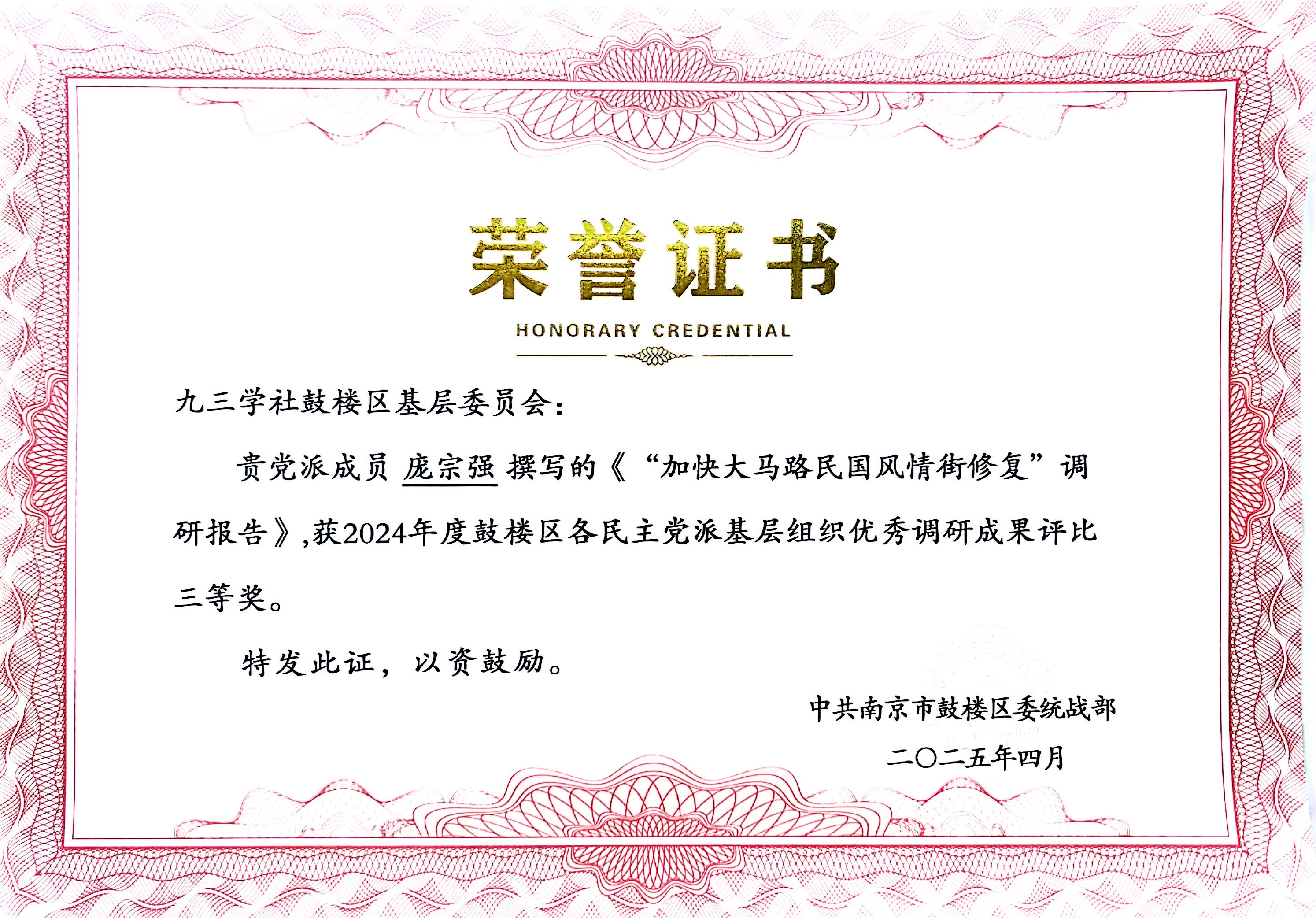 厂长资源 庞宗强老师三项调研成果获鼓楼区民主党派优秀调研成果奖